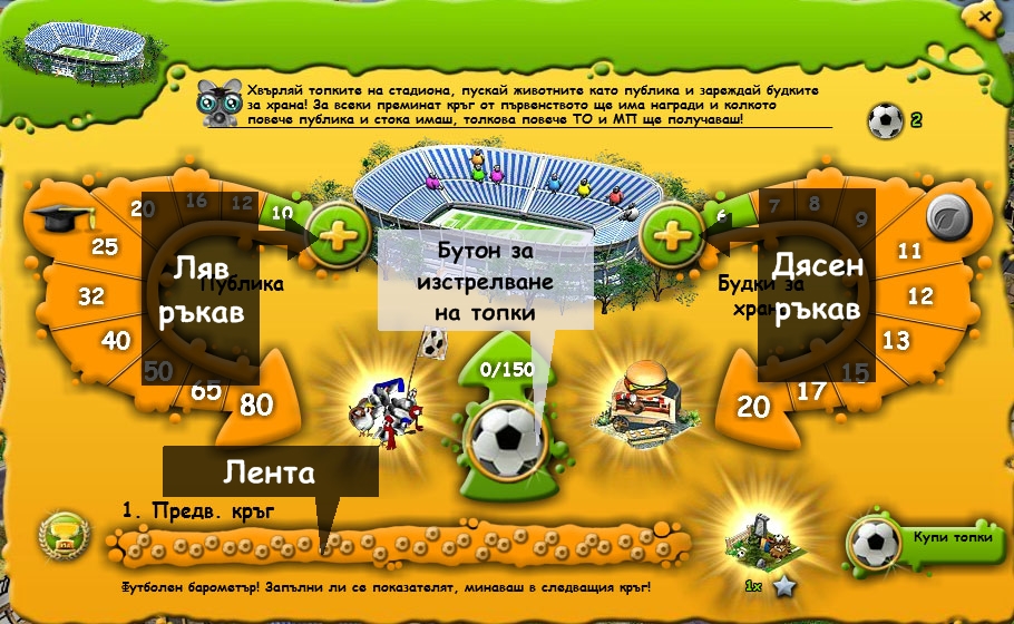 Съвет: Първо запълнете колкото прецените от двата ръкава и после изстрелвайте топките към стадиона. Така за всяка топка ще получите повече ТО и МП.